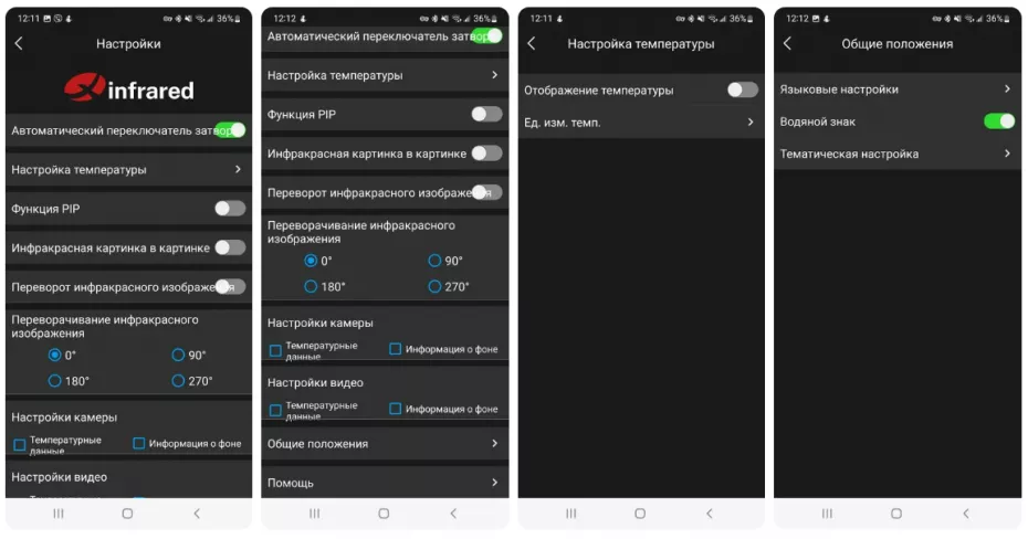 - Настройки температуры. Позволяют отображать примерную температуру объектов. Тепловизор не специализируется на измерении температуры, поэтому тут есть погрешность. В описании указано +- 3 градуса, но в реальности он может ошибаться и сильней, зависит от условий окружающей среды и объекта измерения
