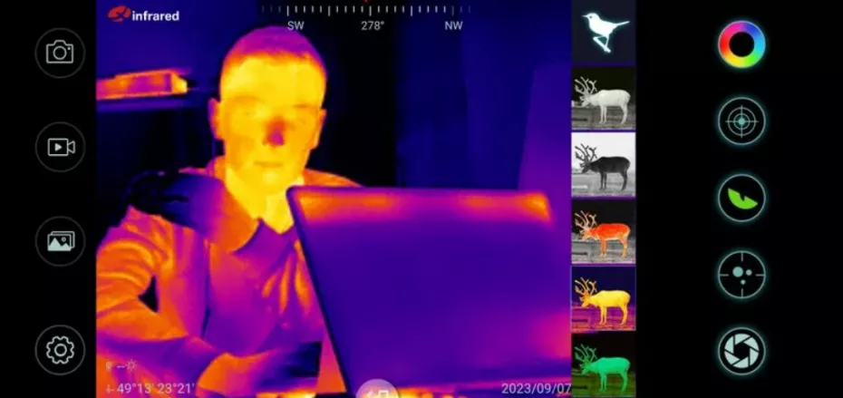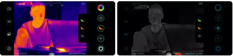 Приложение называется Thermal Eye X и доступно для скачивания в Google Play. Рассмотрим его интерфейсы, возможности и настройки. Центральную часть занимает термограмма (тепловое изображение, созданное в процессе тепловизионного обследования). Слева от нее кнопки для переключения режимов: фото, видео, галерея и настройки. Справа функциональные кнопки. Пройдемся по ним сверху вниз. Разноцветное колечко переключает режимы отображения термограммы, всего их 6: