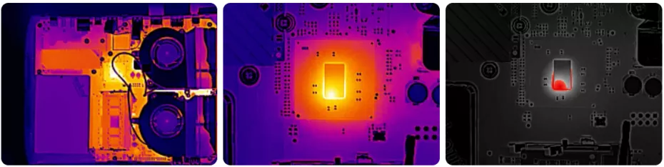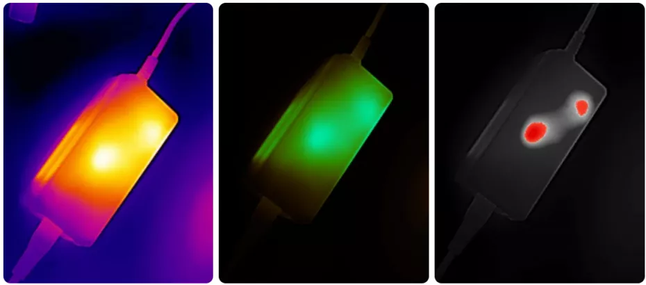 Посмотрим на блок питания ближе. Видим, что нагрев точечный и места повышенной температуры отчетливо видно на всех термограммах.