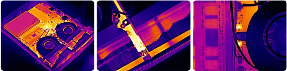 Сняв крышку, можно посмотреть, какие компоненты греются больше. Ожидаемо это процессор и видеокарта (они под радиаторами с вентиляторами). Сюрпризом оказались точечные нагревы некоторых других элементов (чипов).