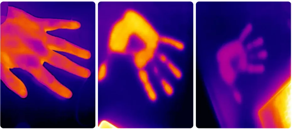 Тепловизор также хорошо фиксирует тепловой след. Кладу руку на стол (первый снимок) и на столе остается тепловой отпечаток (второй снимок). Даже через несколько минут след еще просматривается через тепловизор (третий снимок).