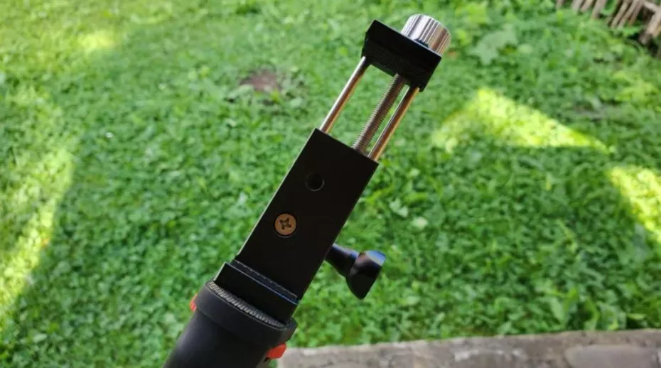 С одной стороны у него установлен холдер для смартфона. Ширина регулируется посредством вращения металлического «барашка» сверху. Максимальная ширина раскрытия 8,8 см, т. е можно использовать практически с любым смартфоном, а вот планшет уже не вместится. Также стоит отметить, что фиксация здесь жесткая. Вы сами затягиваете крепление с необходимым усилием и это гораздо надежней, чем подпружиненные холдеры, которые при активных движениях могут не удержать смартфон.
