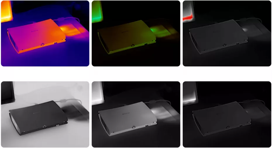 Теперь посмотрим на нагрев мини-пк Alfawise с процессором Core i7 дискретной видеокартой Nvidia. Как обычно, больше всего информации дает «лавовая» термограмма, также хорошо показала себе черно-белая с горячим белым и зеленая. Видно, что компьютер больше греется с правой стороны. Также видно след от горячего воздуха, который выдувается с правой стороны (через вентиляционную решетку). Левая часть ПК, где втягивается воздух — более холодная.
