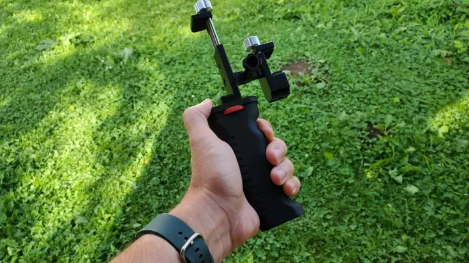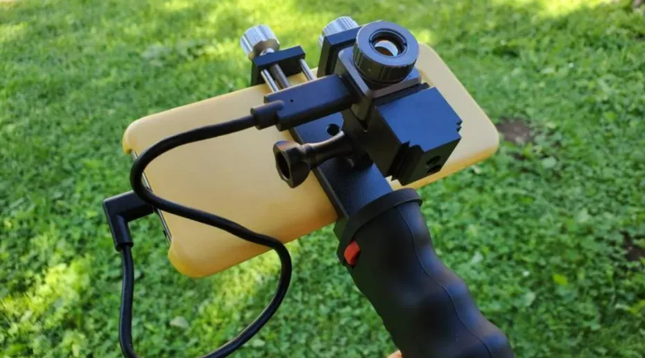С другой стороны холдер для тепловизора, принцип работы аналогичный. Также есть возможность отрегулировать и зафиксировать угол наклона тепловизора. В местах касания холдера с гаджетами использованы резиновые накладки. Сам держатель практически целиком изготовлен из металла, за исключением ручки — она пластиковая.