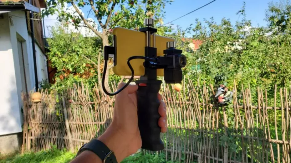 В сборе это выглядит таким образом. Пользоваться в таком виде очень удобно: держите конструкцию за ручку перед собой и сразу видите на экране смартфона термограмму. Можно использовать на ходу.