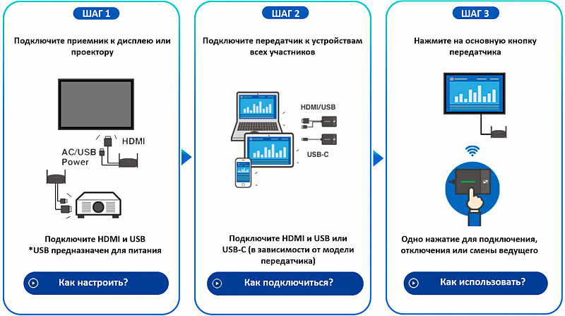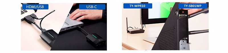 В базовый комплект TY-WPS1 входят два передатчика TY-WPB1 с портами HDMI/USB-A(female)/USB-A(male), приемник TY-WPR10 с портами HDMI/USB-A(female)/RJ45(LAN), а также защитный кейс для хранения и транспортировки устройств. Для работы с мобильными устройствами предусмотрены передатчики TY-WPBC1 с портами USB-A/USB-C. Для передачи данных с Android-девайсов, необходимо установить на них , а при работе с iPhone потребуется AV адаптер Apple. При постоянном использовании PressIT, оптимально будет дополнить систему приемником TY-SB01WP в форм-факторе SDM-модуля для установки непосредственно в дисплеи, что ускорит запуск системы. Дополнительную информацию можно найти на .