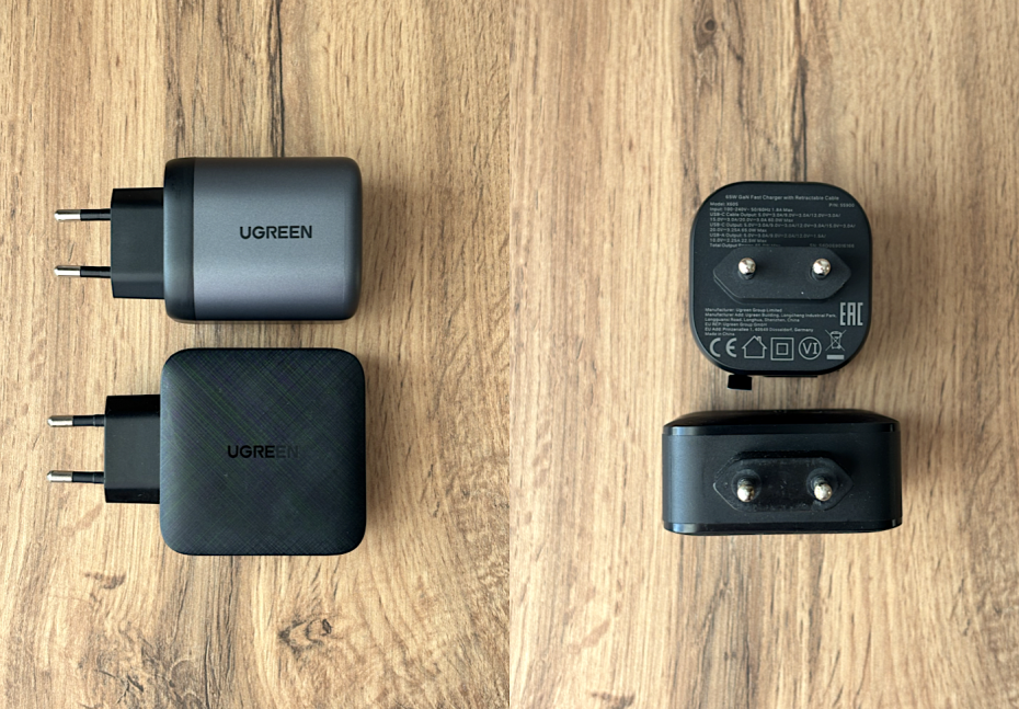 У меня четыре года исправно трудится блок питания UGREEN GaN 65W самого первого образца, с шершавыми боками. Было интересно сравнить габариты, и… они идентичны, если учитывать разную форму корпуса. Блоки равны по высоте, при этом разность толщины и ширины тут почти нивелируется. Оно и понятно, технология GaN пока не изменилась.