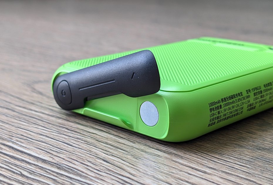 В пауэрбанке предусмотрено всего два интерфейса. Один — это порт USB Type-С на левом торце, он и входной и выходной одновременной. Второй — это площадка беспроводной зарядки на задней стороне, с магнитом под MagSafe. Стоит отметить, что вендор продумал это крепление: встроил не только кольцо, но и фирменный вертикальный фиксатор положения для iPhone. При этом Qi-зарядка работает со всеми устройствами, вплоть до кейса наушников.