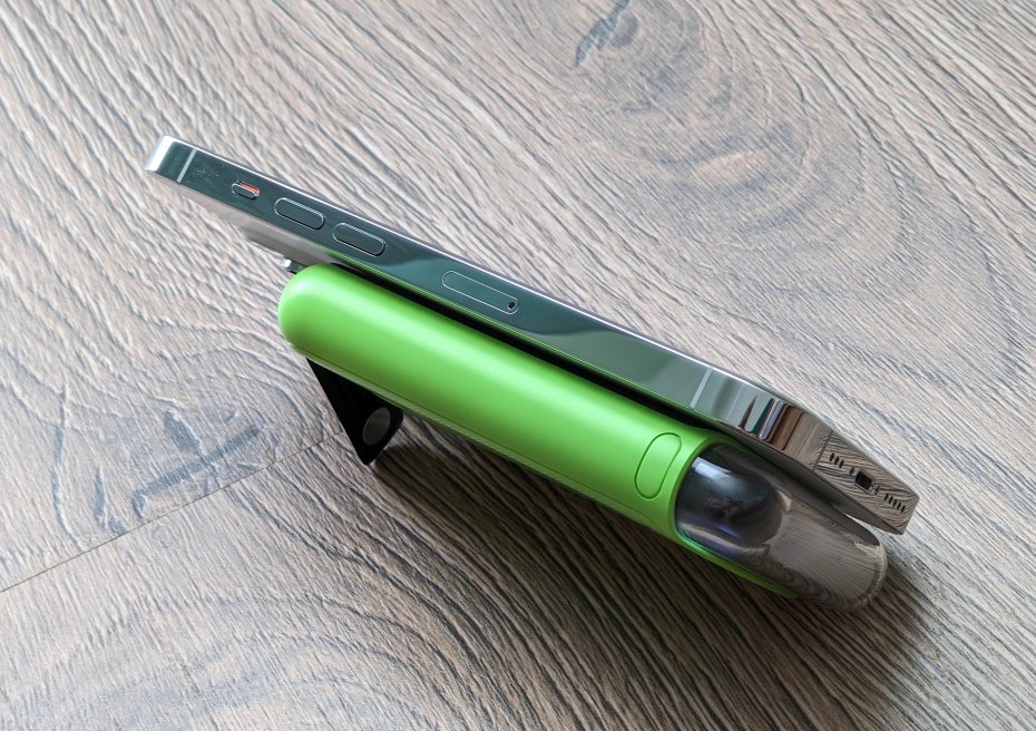 Однако полноценный экспириенс от аксессуара вы получите только при зарядке iPhone 12 и новее: для них здесь предусмотрено полноценное и очень цепкое крепление MagSafe с фиксацией направления. А еще с айфонами повербанк может выполнять роль подставки: с нижнего торца откидывается ножка-подпорка, которая удерживает смартфон на поверхности в наклоненном виде — скажем, для просмотра роликов.