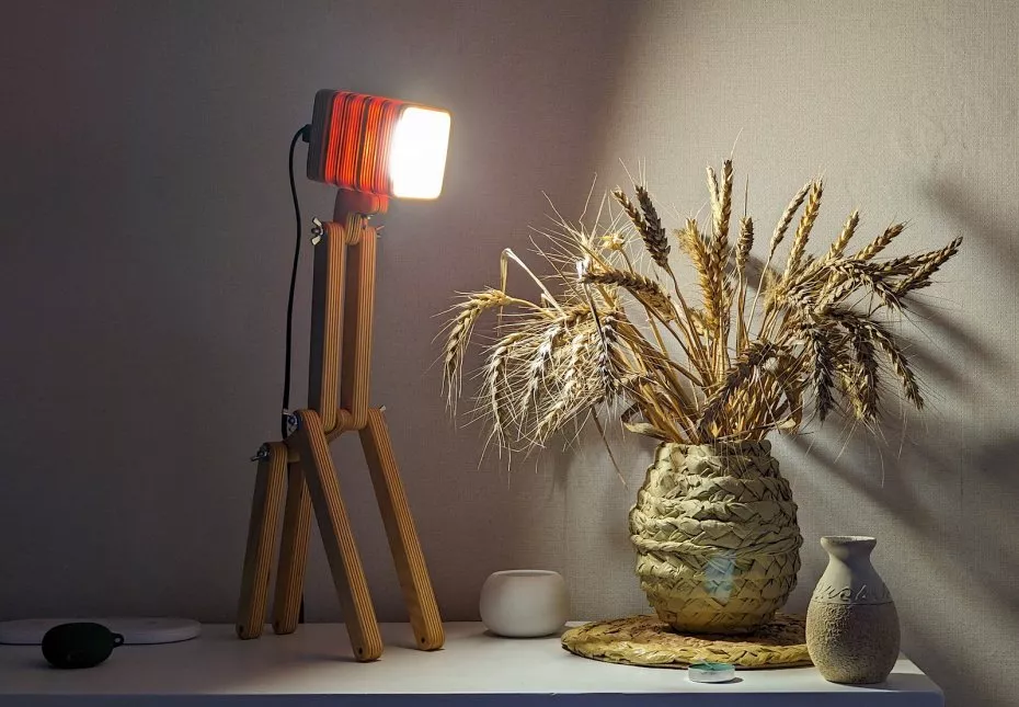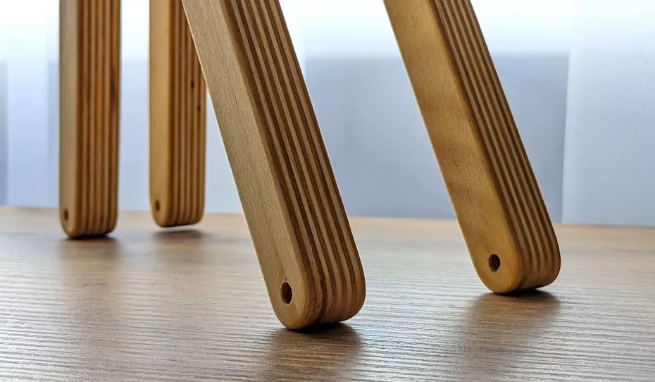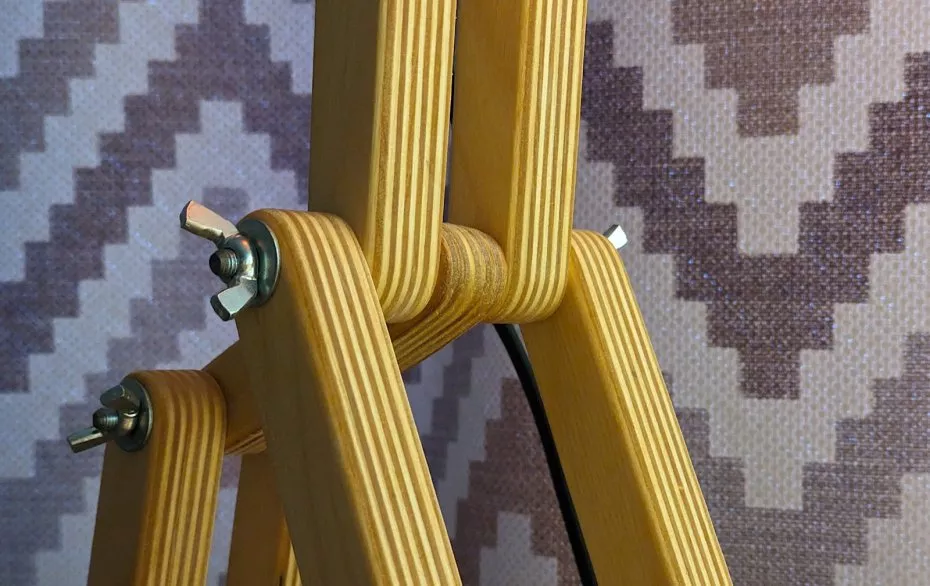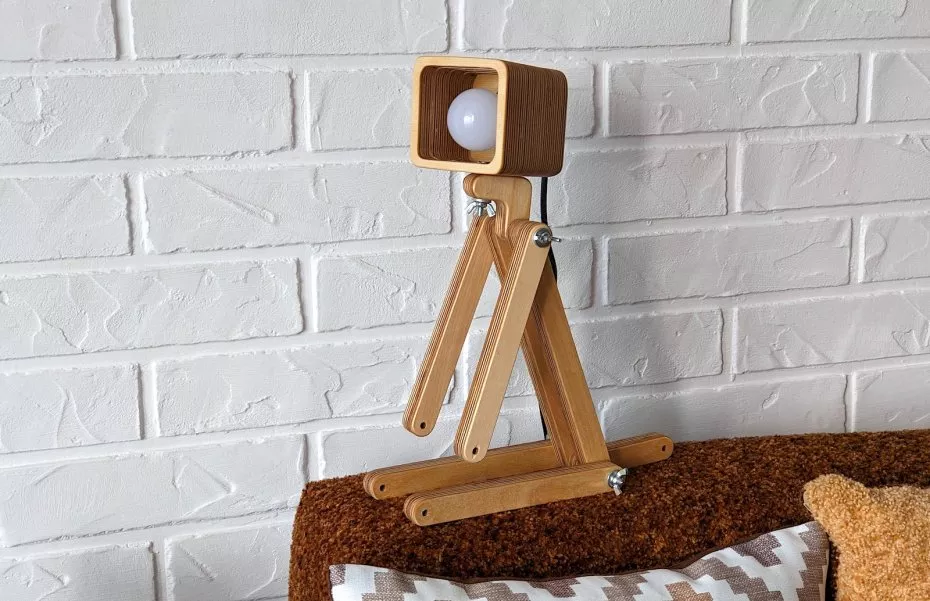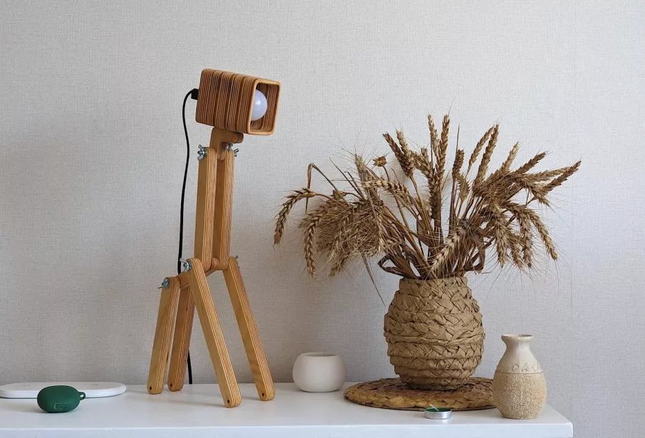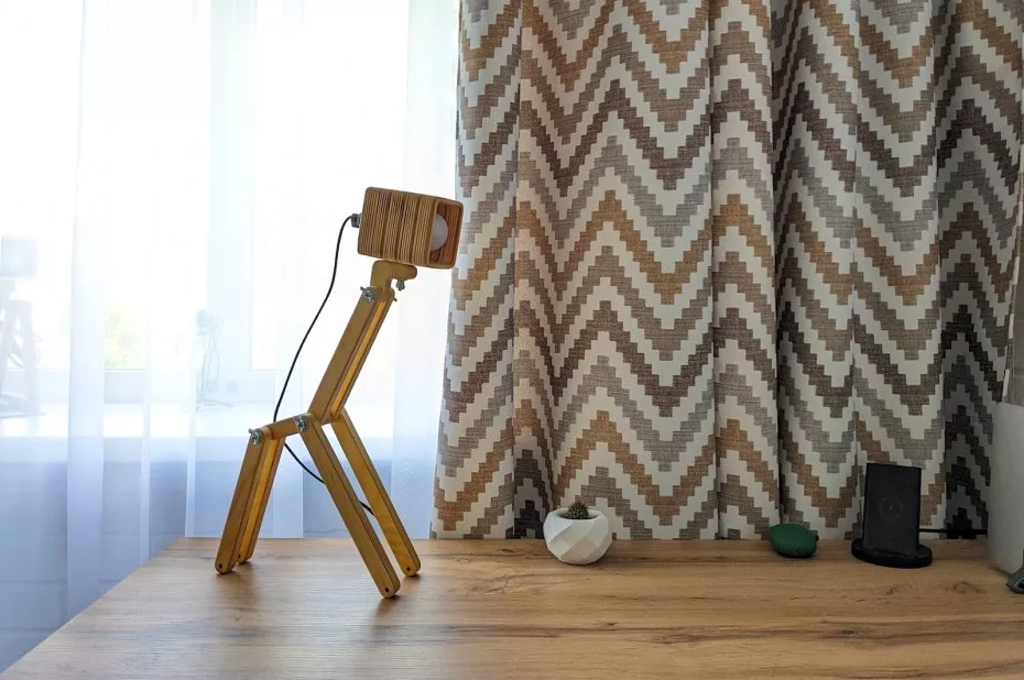 Торшеры не красят, они остаются в естественном цвете фанеры, поэтому подойдут к очень разным интерьерам — как известно, дерево довольно универсальный материал. В нашем случае лампа отлично смотрится как на деревянном столе с цветной шторой, так и на белой тумбе с бежевой стеной. В одном случае она аккуратно подчеркивает тона, а в другом — прикольно выделяется своей геометрией. Торшер приятно рассматривать, когда вы находитесь в помещении, ваш взгляд постоянно на нем останавливается. Собственно, для этого он и нужен.