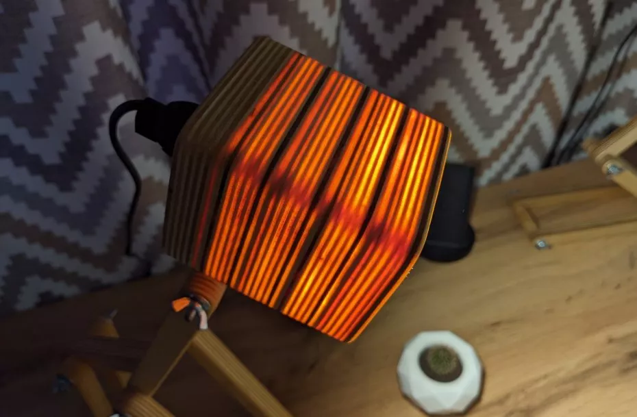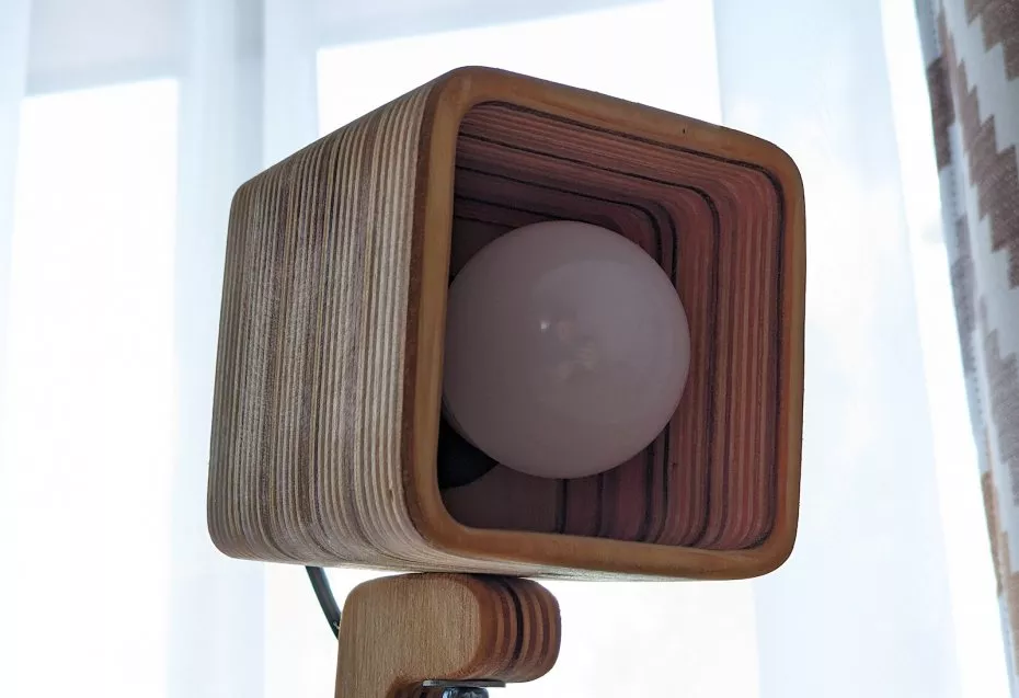 Отдельное внимание уделю плафону. Он выполнен очень необычно: из листа фанеры вырезаны тонкостенные квадраты, которые потом склеены между собой. Получается стильная «полосатая» текстура корпуса плафона — мне очень нравится. Особенно круто это выглядит при включенной лампе: