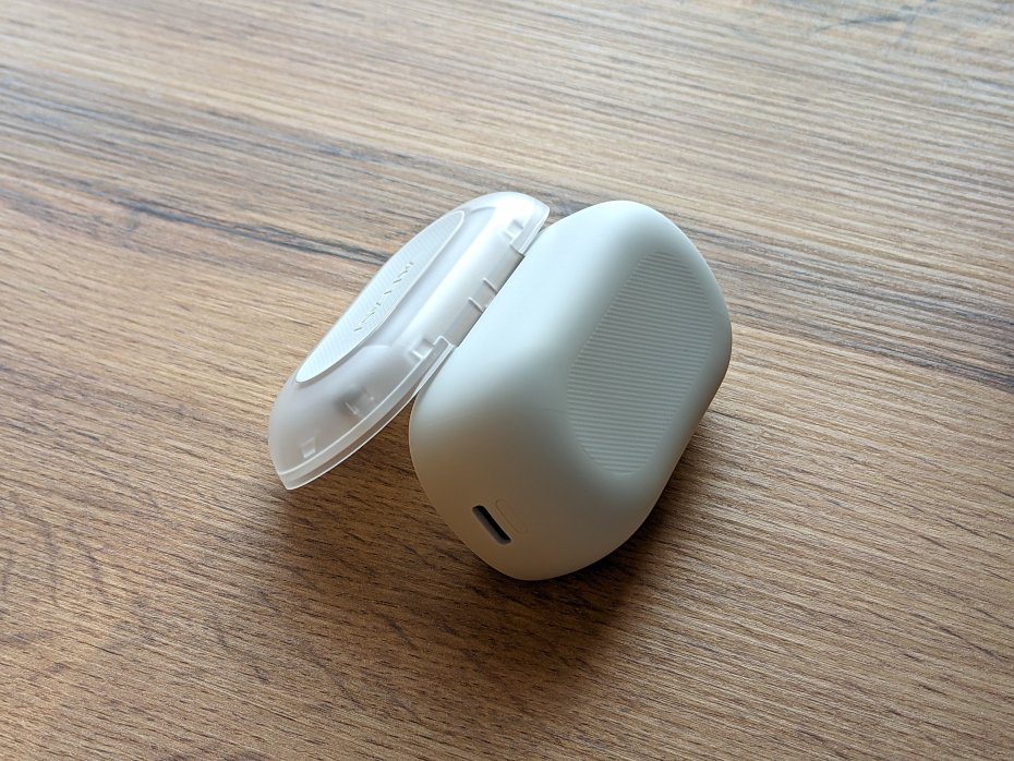 Кейс полностью матовый, но материалы разные. Крышка сделана из полупрозрачного толстого поликарбоната, а нижняя часть тоже пластиковая, но отделана софт-тач-покрытием. Внутри прячутся два наушника, корпус которых почти полностью выполнен из полупрозрачного поликарбоната, за исключением чуть заглубленных сенсорных площадок. На ощупь наушники не то, что прочные, а пожалуй, даже противоударные, но проверять это я конечно же не буду.