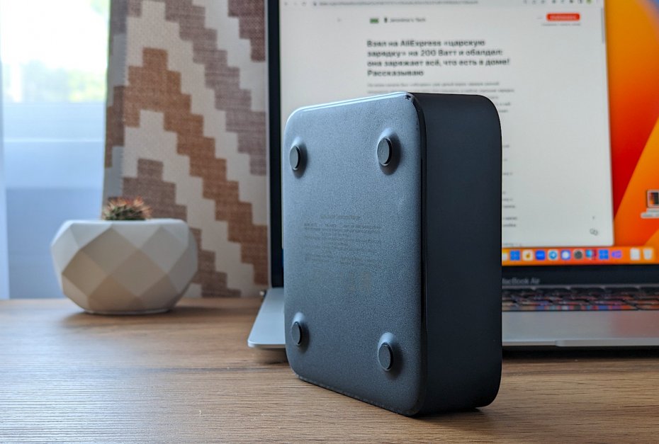 За время тестирования я не слышал от UGREEN 200W никаких посторонних звуков — он лежит на моем рабочем столе, за которым я провожу 4-8 часов в сутки, прямо под правым локтем. Что касается нагрева, то он есть, и это логично с учетом мощности. Но обжечься о зарядник мне ни разу не удалось. Навскидку, температура корпуса доходит до 40-45 градусов. За поверхность стола можно не переживать: ножки приподнимают блок примерно на 3-4 мм, а сами они прорезиненые, так что при всем желании зарядка ничего не сможет вам «припалить».