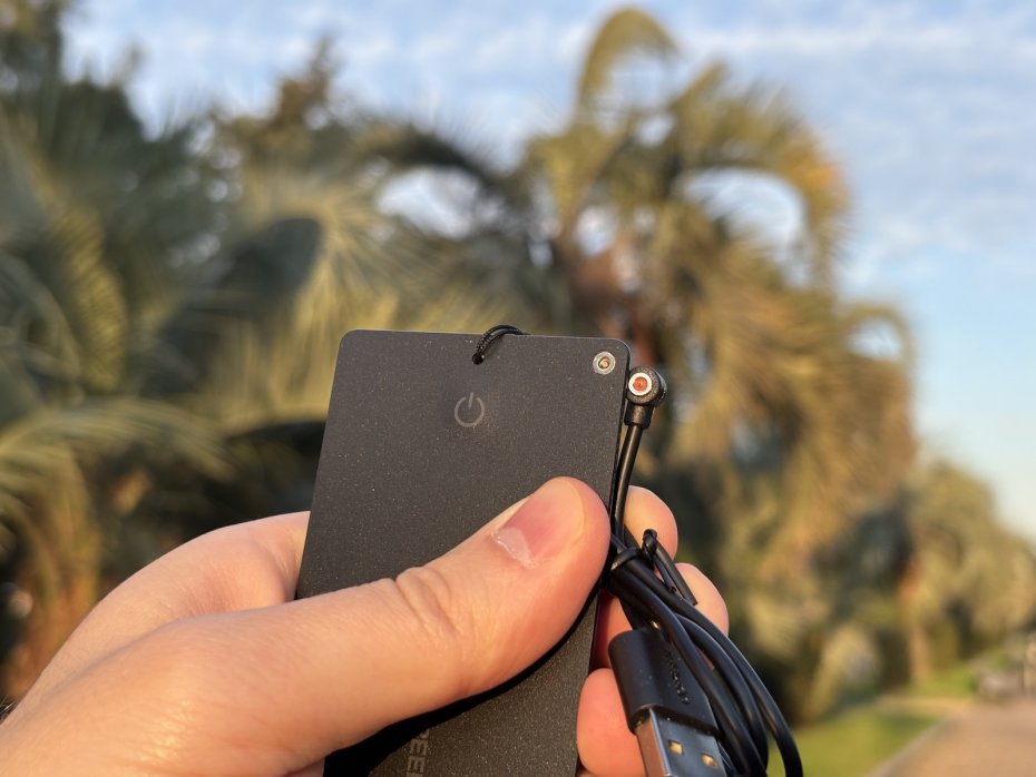 Прямоугольная метка — из черного шершавого пластика, который слегка переливается на свету. Корпус сделан грубовато, без изысков — чувствуется, что ее прадназначали в основном для скрытого хранения. На корпусе есть «пузико» кнопка, а внутри скрывается несъемный перезаряжаемый аккумулятор. На углу есть двухконтактный коннектор для кабеля, такого решения я еще не встречал.