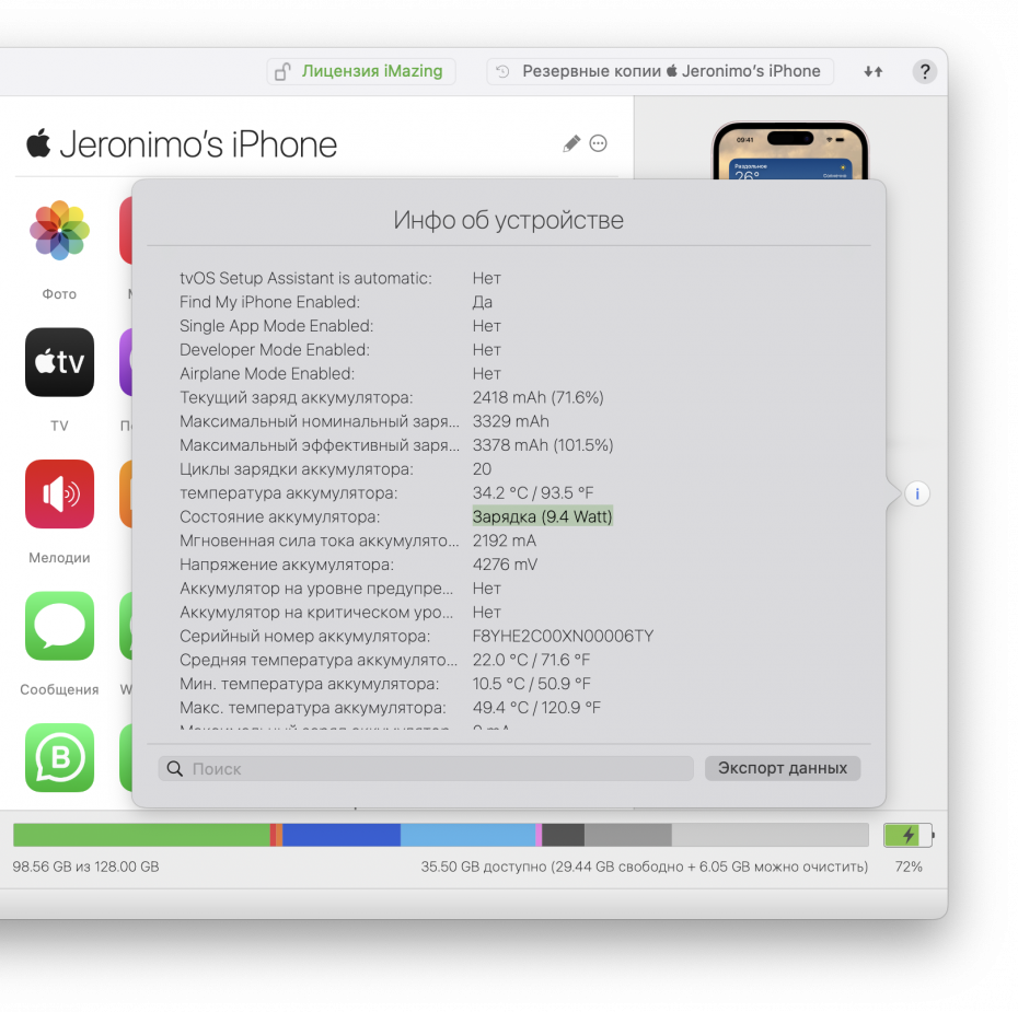 Несколько иначе обстоит дело с MagSafe. Официально здесь нет поддержки 15W по беспроводу для iPhone, то есть заряжаться он должен по 7,5W максимум — однако по факту отображаются более высокие значения. Я проверяю мощность зарядки MagSafe через iMazing по Wi-Fi: