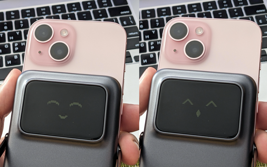 Дисплей цветной: основная информация выдается молочно-белым цветом, а пиктограмма быстрой зарядки — зеленым. Зелеными же будут цифры при 100% заряде банки. Также в системе есть несколько разных смайликов-анимаций, которые призваны показать текущее состояние пауэрбанка и разнообразить взаимодействие с ним. Например: