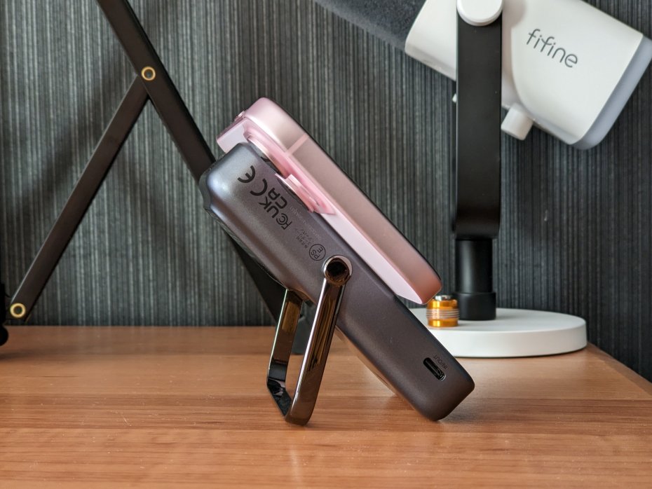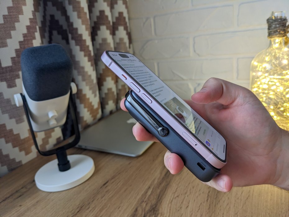 Скоба-подставка. Она нужна, чтобы удерживать пару смартфон+пауэрбанк в вертикальном положении на столе, например, для просмотра видосов или чтения. Свою роль она выполняет просто прекрасно: удерживает как легкий iPhone 15, так и стальной увесистый iPhone 14 Pro Max.