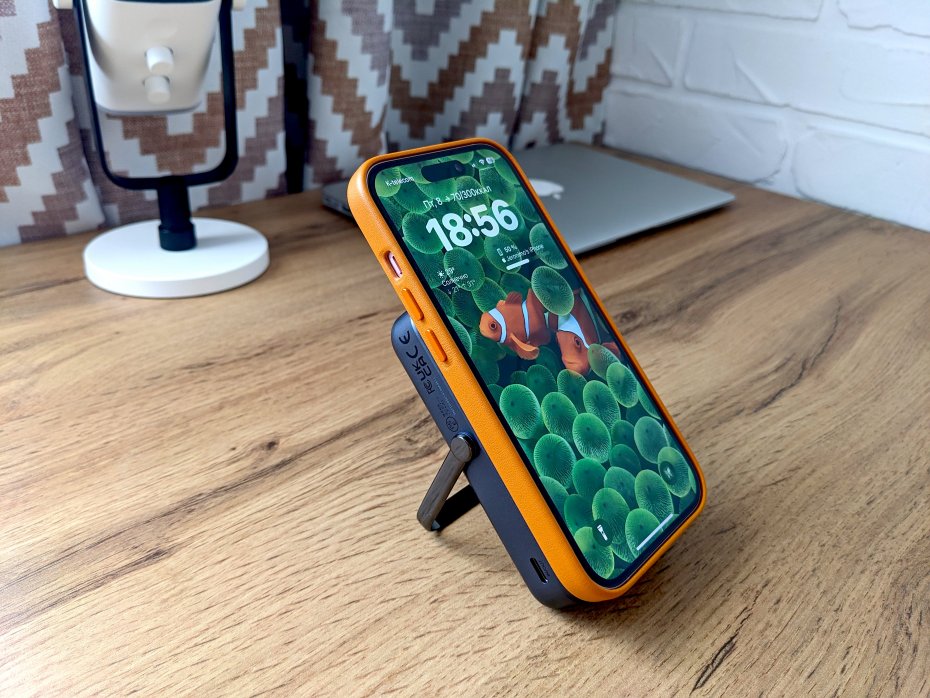 Поначалу я думал, что в режиме подставки предусмотрена только вертикальная ориентация, но спасибо вендору — специально для сообразительных блогеров вроде меня он показал в карточке товара и альбомную ориентацию. Нужно просто примагнитить айфон горизонтально к вертикально стоящему повербанку. Красота!
