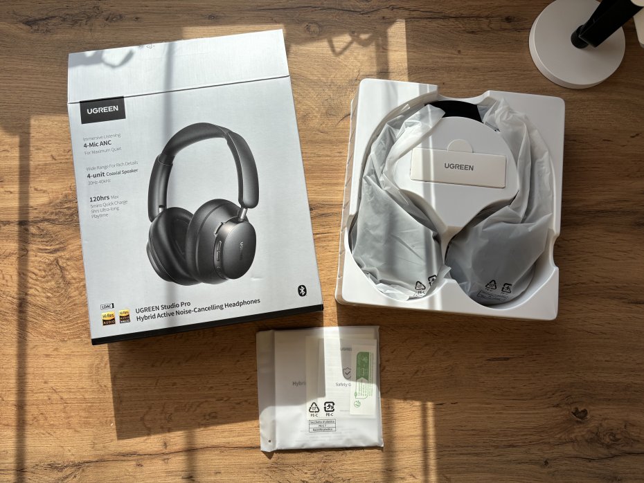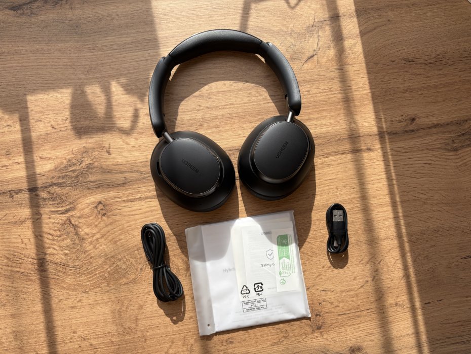 С упаковкой у UGREEN всегда нарядно, красиво и вполне подарочно. Стильная черно-серая коробка сменила серо-зеленый стиль, смотрится достойно. Внутри, помимо наушников, видим кабель зарядки, шнурок для подключения по 3,5 и несколько бумажек. А вот чехла для хранения не завезли; эй, это же Pro, где мой кейс? Ну хотя бы мешочек… Ладно.