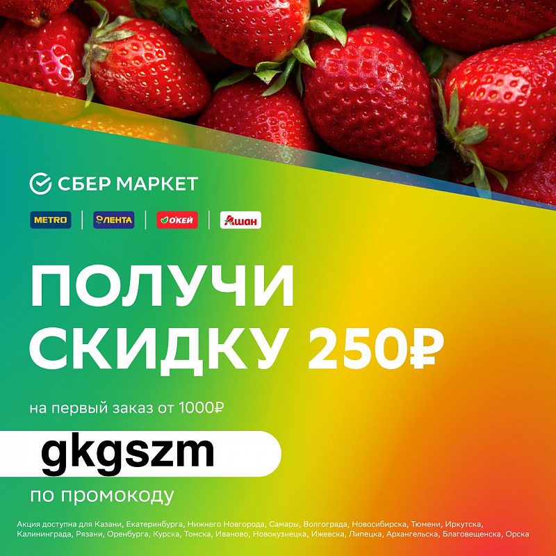 СберМаркет — это онлайн сервис доставки продуктов и товаров первой необходимости с полок магазинов. Промокод для пользователей из Казани, Екатеринбурга, Нижнего Новгорода, Самары, Волгограда, Новосибирска, Тюмени, Иркутска, Калининграда, Рязани, Оренбурга, Курска, Томска, Иваново, Новокузнецка, Ижевска, Липецка, Архангельска, Благовещенска и Орска.