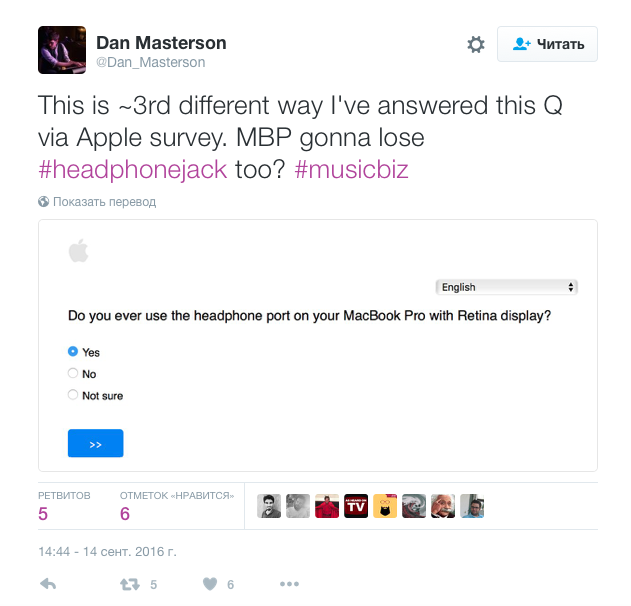 О том, что Apple проводит опрос, пользователи начали сообщать в Twitter. Согласно сообщениям в соцсети, калифорнийская компания спрашивает, использовали ли пользователи когда-нибудь аудио-разъем на MacBook Pro с Retina-дисплеем.
