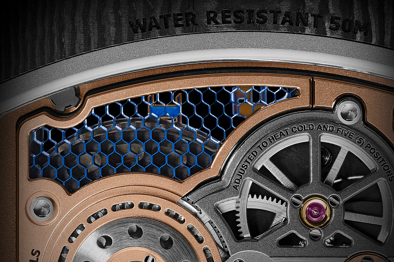 В циферблате используется яркие синие детали, за которые цепляется взгляд. Сотовая структура подложки изготовлена из материала Haynes 214 — это кобальтовый сплав. Если быть точнее, в его состав входят никель, хром и алюминий. Он способен выдерживать температуру 995° C.
