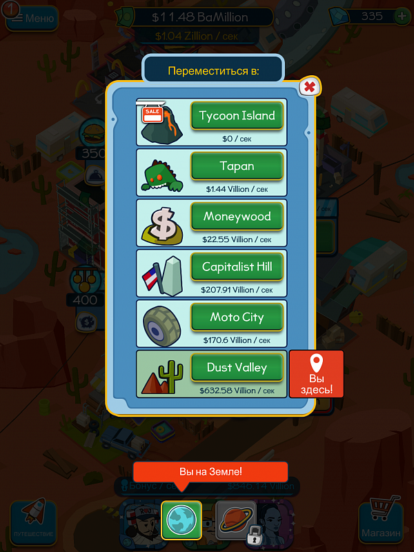 Основной задачей игры является покупка бизнесов (именно так они называются в игре) с последующим их улучшением. Вариантов бизнеса по четыре штуки в каждой локации, локаций шесть. Казалось бы – 24 бизнеса, делов-то. Но не тут-то было. Главный интерес заключается в апгрейдах, которые можно делать практически бессчетное количество раз. Если верить скриншотам на странице игры, тысячный уровень последний. Но поручиться не могу, меня хватило только на 424.