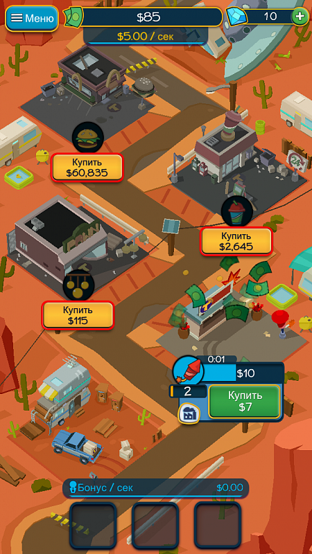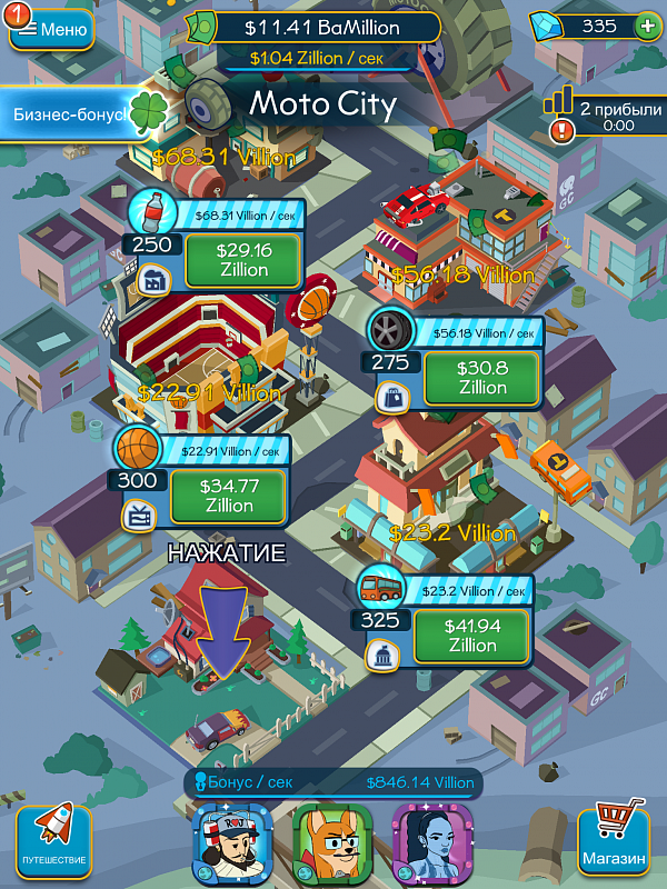На каждой локации мы имеем дом, который сам по себе ничего не дает, но если на него нажать, то в кошелек упадет некоторая сумма денег. Самое сладкое – это то, что нажимать можно сколько угодно раз, и даже достигнуть критического нажатия, получив огромный денежный бонус. Разобравшись со всеми тонкостями, весь игровой процесс сводится к тупейшему тыканию на один из ваших домов, а потом на бизнесы, с целью потратить нафармленные деньги, чтобы заработать больше-больше-больше!