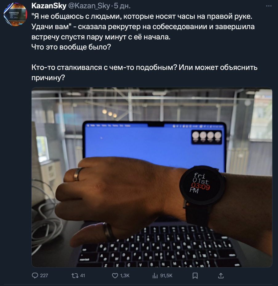 Возможно эта должность не подразумевает лидерских качеств и амбициозный человек внес бы в коллектив фактор нестабильности. «С чего они взяли, а если я левша и мне просто удобно?» На этот счет могу вам сказать что левшей условно в процентах в реальной жизни 3-5 и носят часы они как правило на внутренней стороне запястья. Вот может вас и слили чтобы не гадать и не выглядеть глупо с вопросом « Вы левша?»