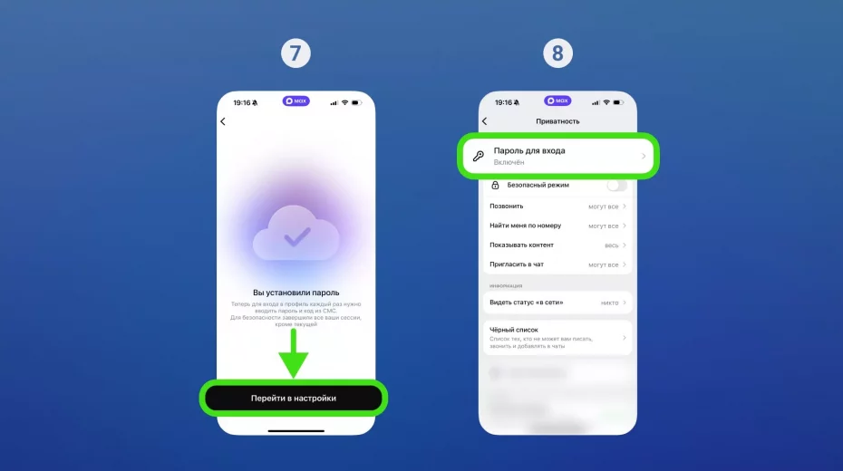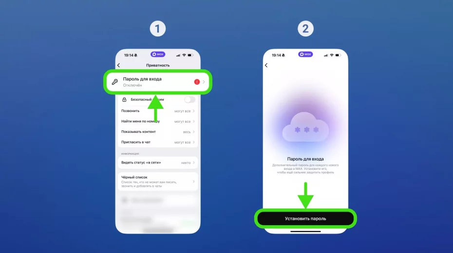 1. Откройте аккаунт в МАХ, в нижнем правом углу выберите раздел «Профиль», затем нажмите «Приватность», выберите «Пароль для входа»