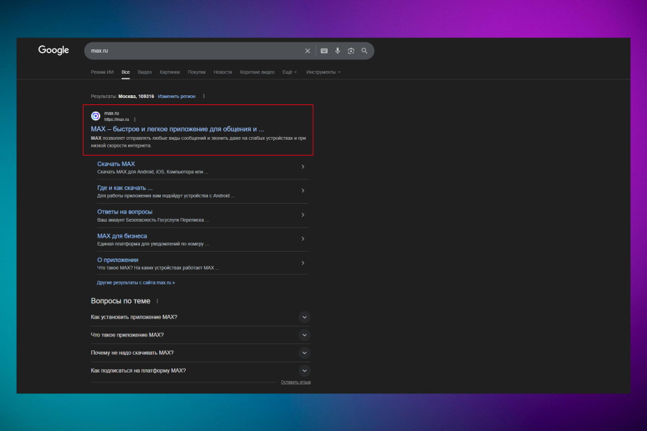 • В поиске пишем «max.ru»
