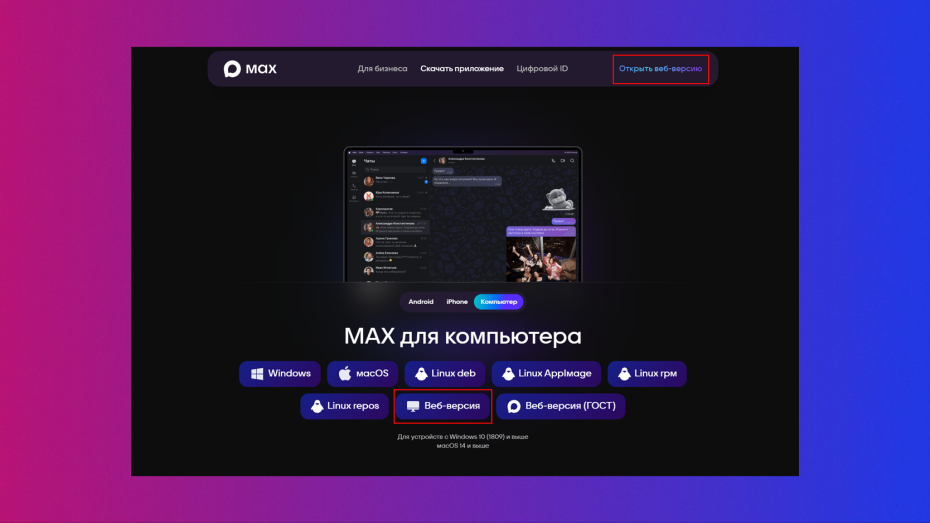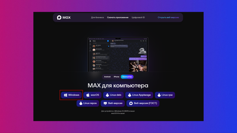 Для пользователей ПК под управлением Windows установка MAX проблем не вызовет — тут все, как и с любым другим софтом. Однако стоит помнить, что мессенджер поддерживается только в Windows 10 версии 1809 и новее, включая Windows 11.