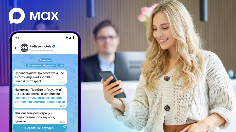 Международная гостиничная сеть начала тестировать в МАХ сервис предварительного оформления документов для заселения. После бронирования номера на сайте достаточно зайти в чат-бот отеля в нацмессенджере и дать согласие на обработку данных. Сервис доступен в отеле премиум-класса Radisson Blu Ленинский проспект в Москве и в дальнейшем будет масштабирован на всю сеть Radisson Hotel Group.