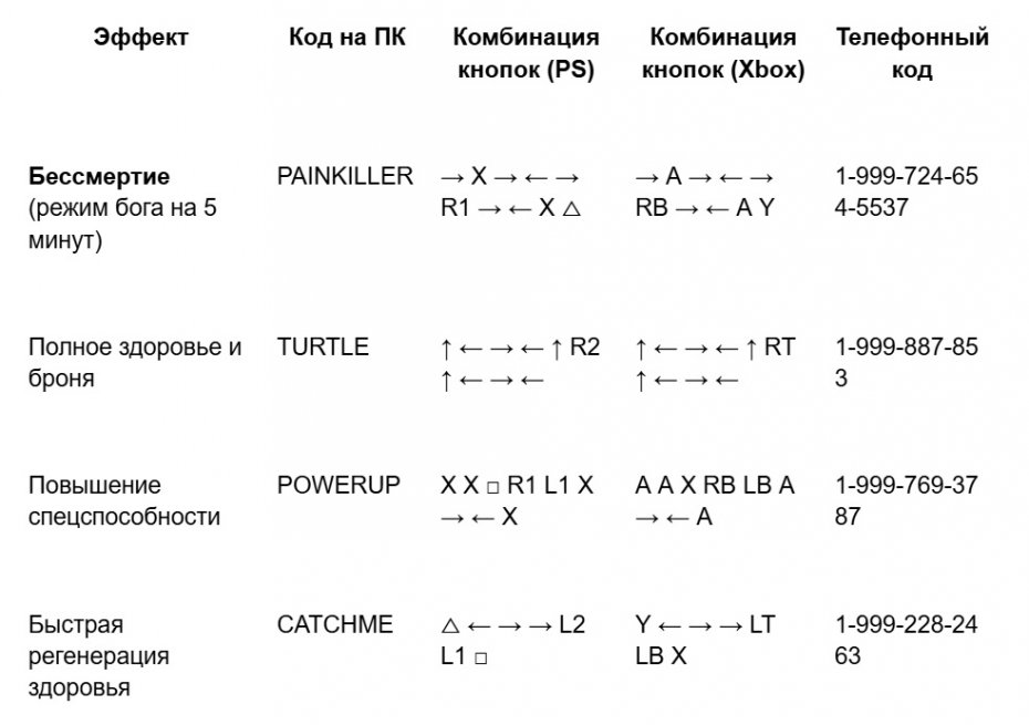 - Ввести нужный код (например, PAINKILLER для активации режима бога или TURTLE для восстановления здоровья и брони).