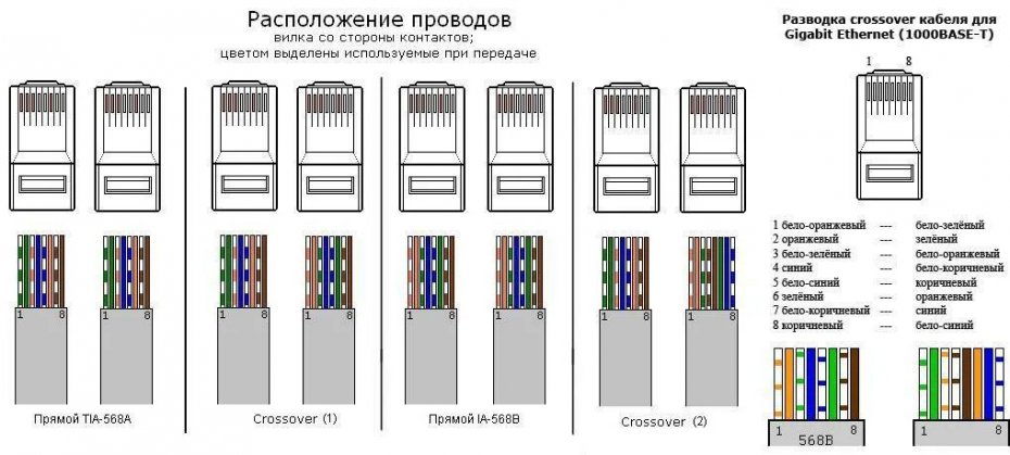 - Перекрестная схема (Crossover) применяется для прямого соединения двух компьютеров или двух сетевых устройств без посредника. Она отличается перестановкой некоторых жил (бело-оранжевый меняется местами с бело-зеленым).