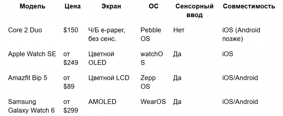 Core 2 Duo — умные часы, которые возвращают минимализм в индустрию, где большинство брендов стремятся впечатлить обилием функций. Здесь нет сенсорного ввода, а вместо него — чёткие физические кнопки и монохромный e-paper дисплей. Работа идёт на PebbleOS с открытым исходным кодом, что даёт разработчикам приложений свободу в создании новых функций. В отличие от популярных моделей вроде Samsung Galaxy Watch или Apple Watch, Core 2 Duo концентрируются на стабильности, простоте и длительной работе без подзарядки.