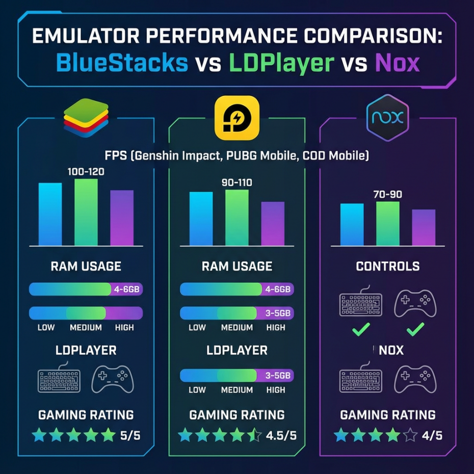 - высокий и стабильный FPS (60–120) лучше показывают LDPlayer и BlueStacks Hyper;