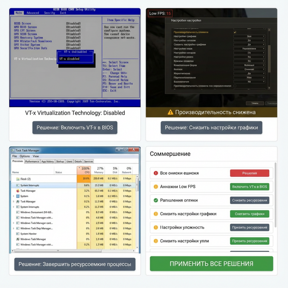 Для удобства можно держать в голове простой чек-лист: VT-x включен → SSD → драйверы обновлены → свободно достаточно ОЗУ.