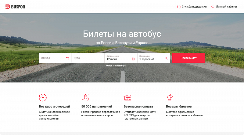 У Busfor интуитивно понятный интерфейс поиска, покупать на портале просто и быстро. Онлайн-резервирование намного удобнее стояния в очереди в кассу. Основные плюсы — не нужно никуда ехать, и покупать можно хоть в три часа ночи. Интернет-портал не закроется, как вокзальная касса, а продавец не уйдет пить чай на пару часов. Все, что нужно — выбрать поле с подходящим маршрутом, временем посадки, стоимостью и кликнуть на кнопку «купить». Ресурс перенаправляет покупателя на страницу заполнения информации, дает подсказки, как правильно вносить данные в поля и оплачивать покупку.