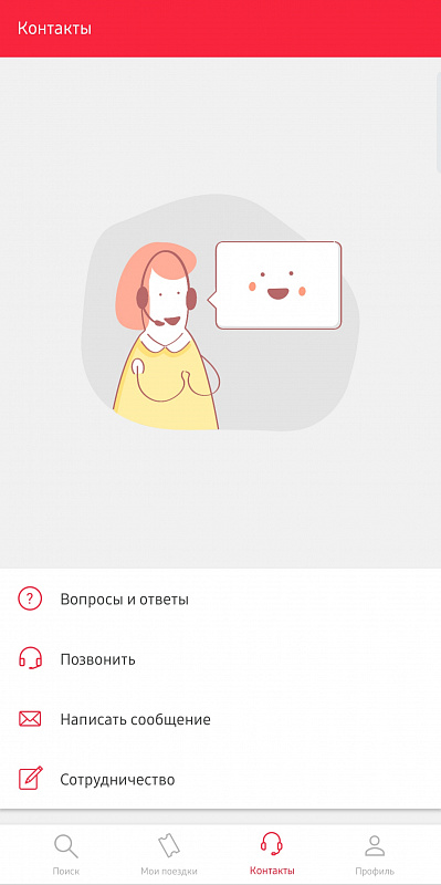 При неординарной ситуации, либо если вы не разобрались на каком-то этапе покупки/возврата билета, обратитесь в службу поддержки. Для этого в нижней части приложения нужно нажать на вкладку “Контакты” и выбрать подходящий вариант для связи с технической поддержкой Busfor.