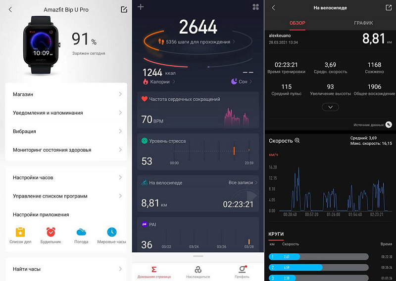 Несмотря на невысокую цену, модель Amazfit Bip U Pro можно считать одной из топовых в линейке Bip. Её главное отличие от более дешёвых (и даже некоторых более дорогих) моделей заключается в наличии модуля GPS. Благодаря этой возможности, можно гулять, бегать и кататься на лыжах или велосипеде не беря с собой смартфон — точная траектория движения и другие показатели, вроде скорости подъёма и спуска, всё равно зафиксируются, будут занесены в мобильное приложение Zepp и синхронизируются с другими привязанными приложениями (например, «Здоровье» на iOS и Google Fit на Android). Когда смартфон рядом, GPS-модуль часов не задействуется, а трек движения строится по данным, взятым от смартфона.