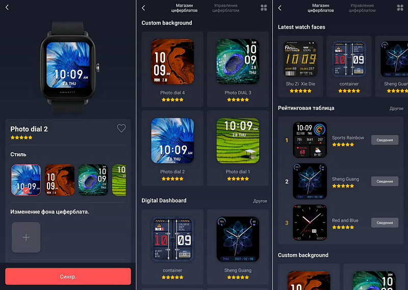 Часы поддерживают сопряжение с Android-смартфонами и iPhone через мобильное приложение Zepp. В этом приложении можно настроить их строго под себя, выбрать понравившийся циферблат и указать, какие уведомления могут приходить (о звонках, SMS и от конкретных приложений). Там же доступна вся собранная часами статистика о физических показателях, активности, занятиях спортом и качестве сна. Даже можно наглядно сравнивать свои достижения по неделям и месяцам, чтобы понять, стали ли вы более активны или расслабились. В приложении десятки циферблатов, некоторые из них можно настроить, выбрав, какая информация будет выводиться, а какая вам не нужна.
