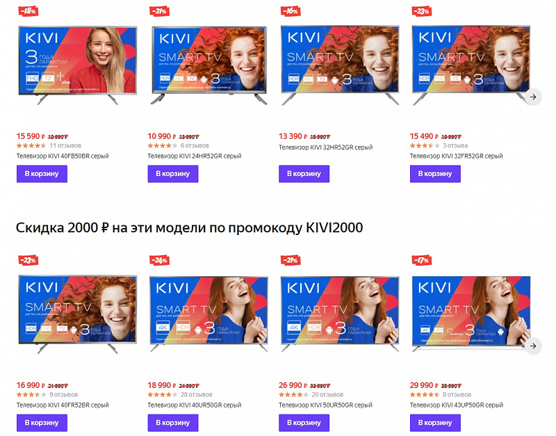 Магазин «Беру» принадлежит «Яндексу» и «Сбербанку». Он очень хорошо зарекомендовал себя и на этой неделе проводит распродажу телевизоров нового бренда KIVI. Они и так стоят достаточно дёшево, а до 19 ноября их можно купить ещё выгоднее, благодаря промокодам на скидку до 2000 рублей. Имейте в виду, что цены указаны без учёта промокода, дополнительная скидка отобразится в корзине в момент оформления покупки.