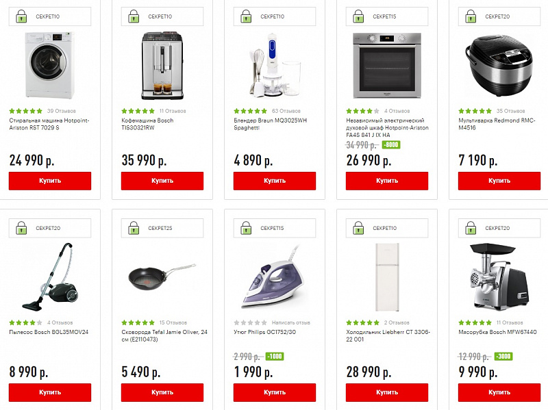«М.Видео» предлагает кэшбэк бонусными баллами в размере 9% от стоимости покупки. Эти баллы можно будет использовать при оформлении следующих покупок. Кроме того, в этой сети магазинов предоставляется скидка 30% на второй товар или 50% на третий товар в чеке. При покупке от 5000 рублей возможна бесплатная доставка домой.