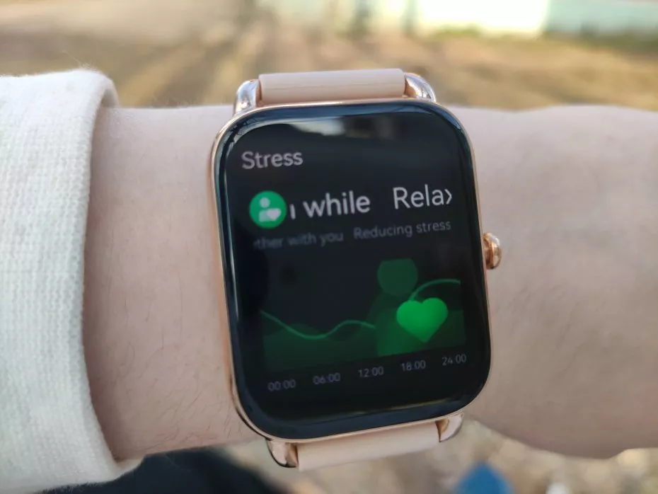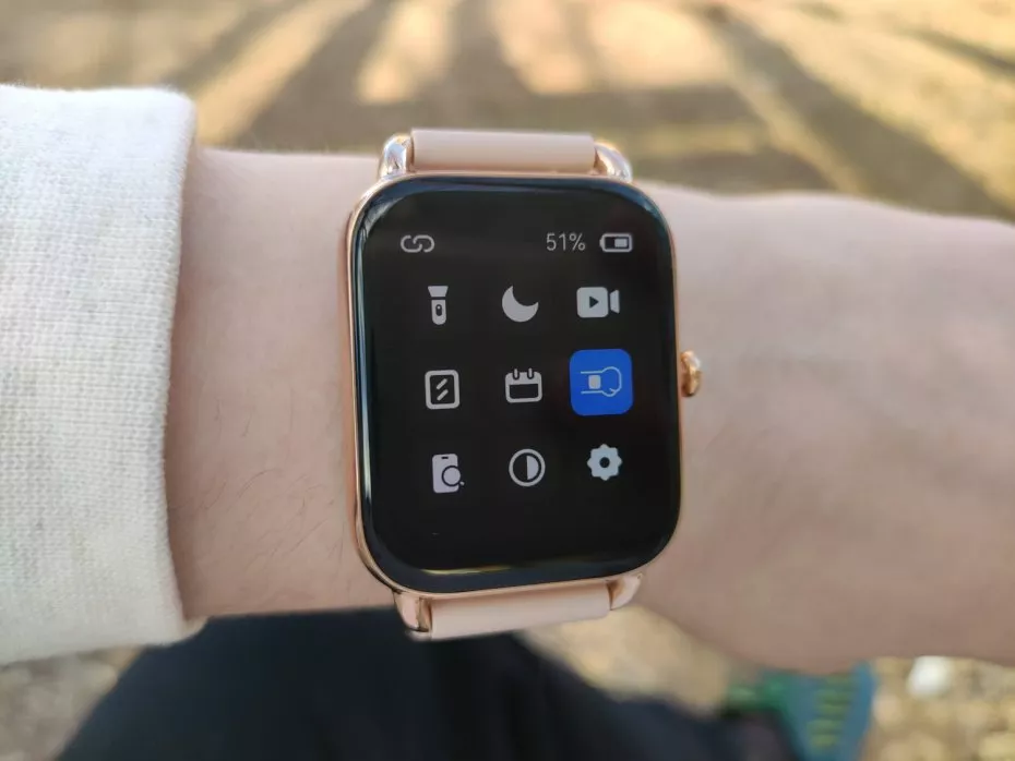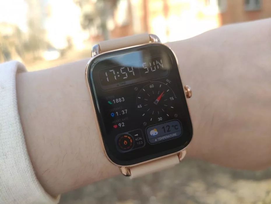 У этих часов AMOLED-экран с диагональю 1,78 дюйма и разрешением 368х448 пикселей. Запаса яркости с лихвой хватает на то, чтобы информация на циферблате была хорошо видна в солнечный день, даже не нужно выкручивать её на максимум, вполне достаточно 50-70%. Авторегулировки яркости в зависимости от внешнего освещения не предусмотрено, поскольку у часов нет датчика освещённости.