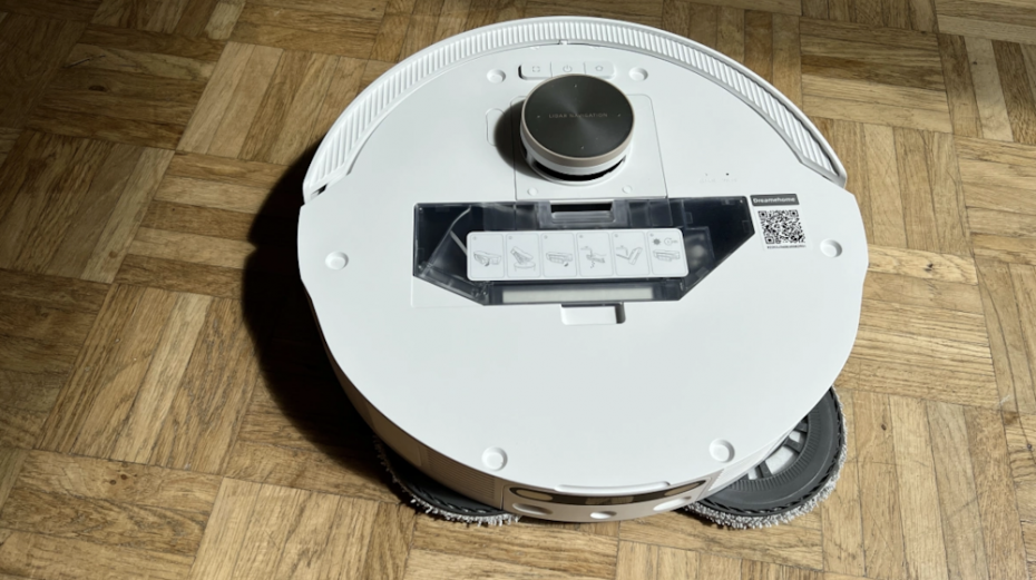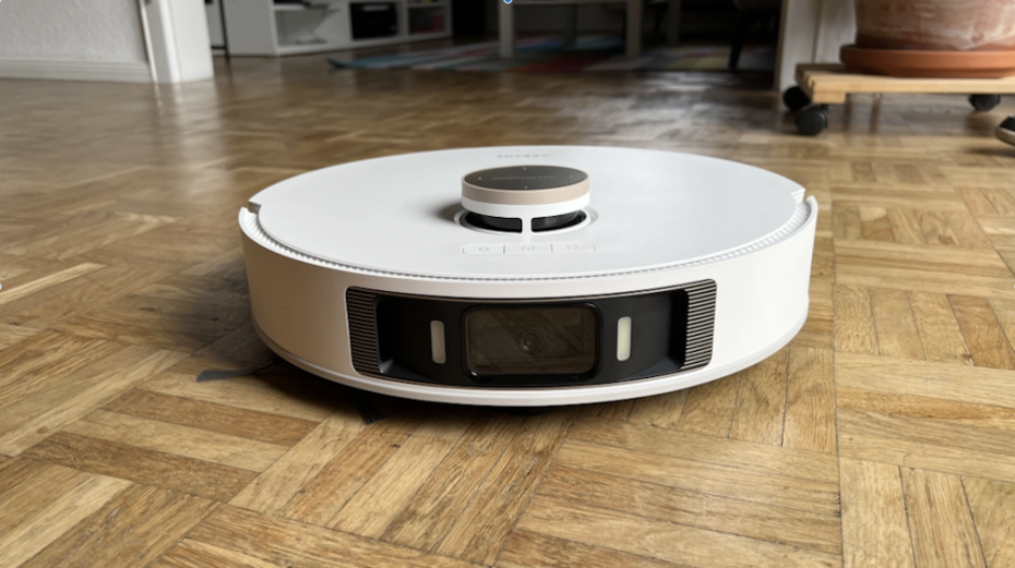 Дизайн: у него матовая покрытие, отдельные детали корпуса получили красивый металлический карбоновый оттенок. Выглядит роскошно и очень современно. На верхней панели расположены три кнопки: отправить пылесос на зарядку, активировать точечное очищение, а также включить или выключить его. Впереди за стеклом находится датчик, который определяет крупные препятствия, в передней панели также расположилась камера с парой мощных фонарей и там же находится 3D-датчик, при помощи которого робот распознает объекты, справа на боковой панели расположился датчик стены (да, такое тоже бывает), сверху находится башня с лидаром, которая предотвращает застревание под мебелью с помощью пружинного блока, снизу находится четыре датчика с защитой от падения и ультразвуковой датчик для распознавания поверхностей (например ковра).