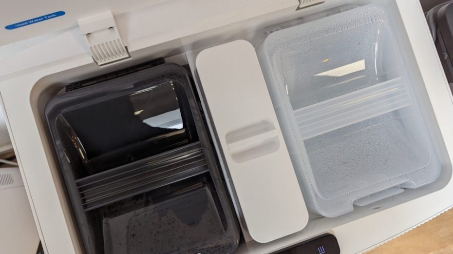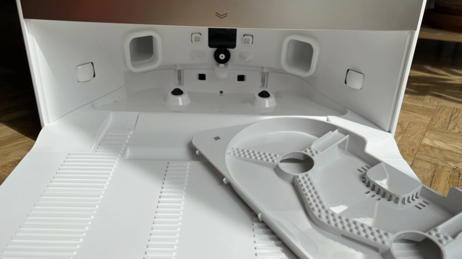 Станция такая же не менее стильная и служит не только питанием для робота, но и он сбрасывает в нее мусор путем сильного воздухозабора, заправляет робот водой и очистителем, чистит салфетки и тут же их сушит, чтобы не появилась плесень. Что очень сильно удивило к станции можно докупить комплект для подключения к водопроводу, что дает ей быть постоянно автономной, менять воду, заливать в пылесос чистую воду, а грязная вода будет сливаться в канализацию… Ух.