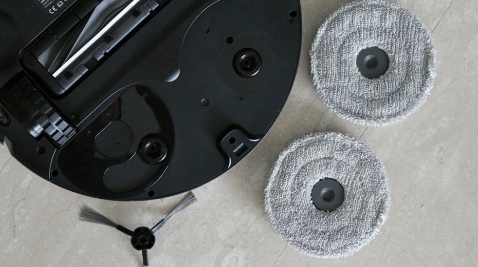 Сам пылесос круглой формы и поставляется в двух цветах — черный и белый. Белый мне кажется практичней. Под верхней крышкой пылесоса находится пылесборник с HEPA-фильтром (его можно промыть проточной водой). Внутри расположился резервуар для воды с емкостью 80 мл, а снизу боковая трёхлучевая щётка, плавающий блок центральной щётки (она съемная и можно легко чистить) и две круглые вращающиеся салфетки из микрофибры. А что самое интересное — одна из них может отдельно подниматься и протирать например плинтусы или углы комнаты, такого я еще не видел.