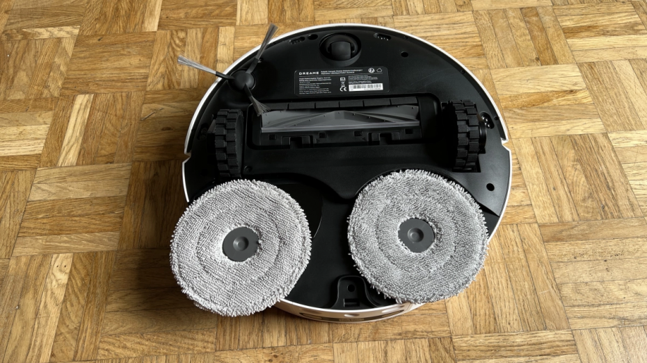 Сам пылесос круглой формы и поставляется в двух цветах — черный и белый. Белый мне кажется практичней. Под верхней крышкой пылесоса находится пылесборник с HEPA-фильтром (его можно промыть проточной водой). Внутри расположился резервуар для воды с емкостью 80 мл, а снизу боковая трёхлучевая щётка, плавающий блок центральной щётки (она съемная и можно легко чистить) и две круглые вращающиеся салфетки из микрофибры. А что самое интересное — одна из них может отдельно подниматься и протирать например плинтусы или углы комнаты, такого я еще не видел.