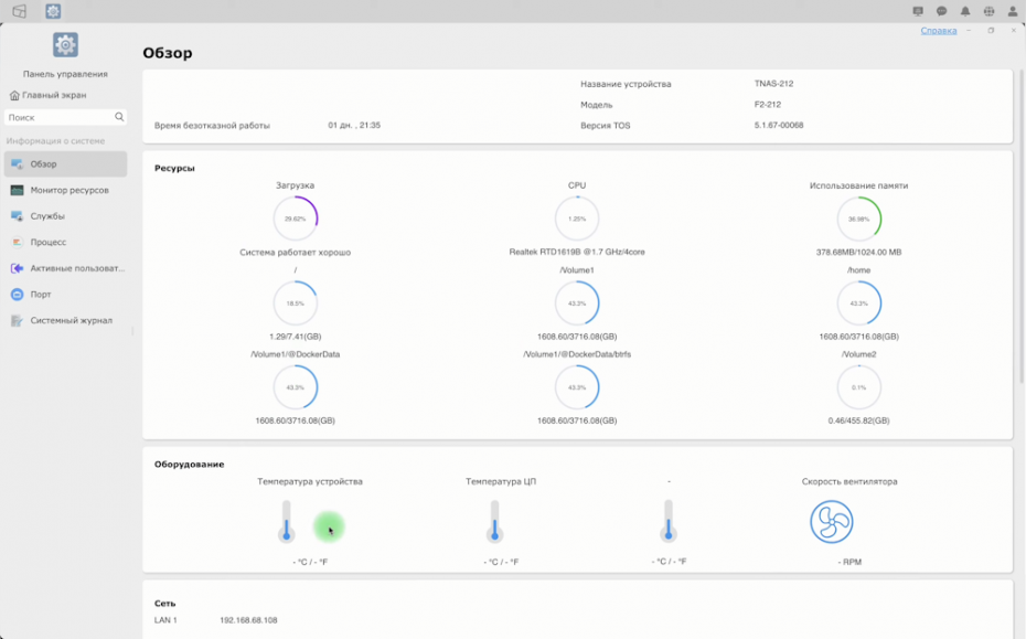 Не стоит думать, что это просто примитивный кейс для подключения винчестеров к компьютеру, вовсе нет. За работу F2-212 отвечает мощная электронная начинка: процессор Realtek RTD 1619B с четырьмя ядрами ARM V8.2 Cortex-A55, 1 ГБ оперативной памяти и видеоускоритель, которые вместе с фирменной операционной системой TerraMaster OS (она же TOS) выполняют множество задач: распределение файлов по RAID-массиву, шифрование, облачный доступ, аппаратное кодирование и декодирование видео, функционирование различных приложений, в том числе мультимедийных.